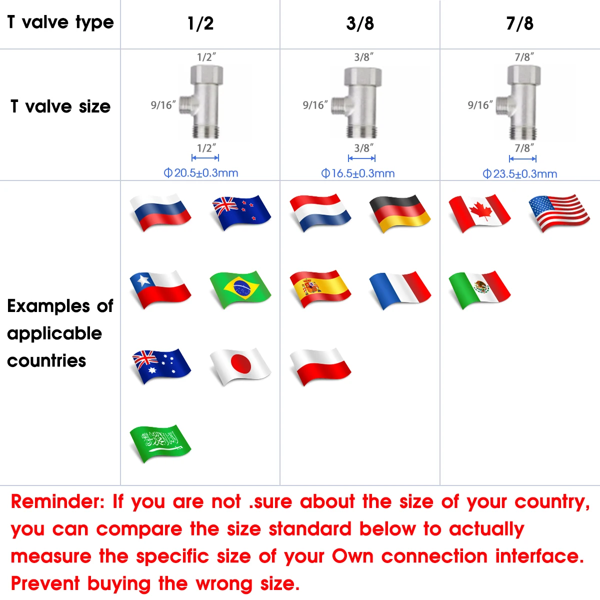 T-adapt diferente para diferentes países, Ásia/RU/AU/Reino Unido/América do Sul é 1/2, Europa é 3/8, América do Norte é 7/8. Se for diferente da válvula T em casa você conhece, observe o tamanho ao fazer o pedido.